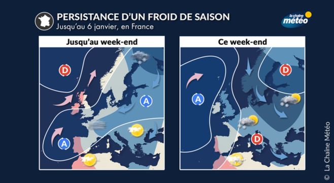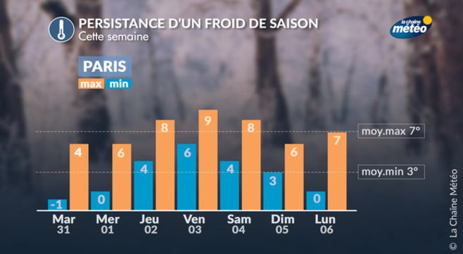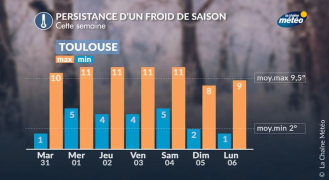Les minimales seront le plus souvent comprises entre -3 et 5°C d'est en ouest à la Méditerranée le matin. L'après-midi, les maximales afficheront de 5°C au nord-est à 10°C dans le sud-ouest, jusqu'à 13°C près de la Méditerranée. Ces températures n'évolueront pas beaucoup d'un jour sur l'autre et seront globalement conformes aux normales de saison, voire légèrement inférieures d'1 à 2°C de mercredi à vendredi.