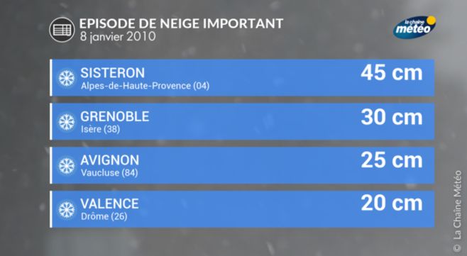 Le 8 janvier, de l'air humide venu de Méditerranée se heurte à de l'air très froid en provenance d'Europe centrale si bien que de fortes chutes de neige se produisent dans le sud-est. On relève 20 cm de neige à Valence, 30 cm dans les régions d'Avignon et Grenoble et jusqu'à 45 cm à Sisteron dans les Alpes-de-Haute-Provence. Dans la région d'Arles (13) où la neige est abondante, 10 000 foyers se retrouvent privés d'électricité. Les transports ferroviaires sont très perturbées dans le sud-est.