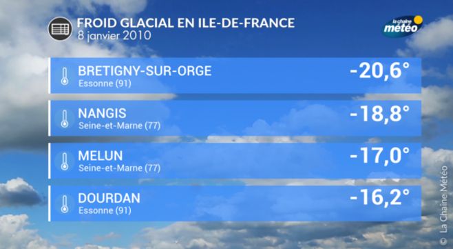 Sur les sols enneigés et lorsque le ciel est dégagé pendant la nuit, les températures sont glaciales. C'est dans la nuit du 8 janvier que l'on relève les températures les plus basses. Un record de froid est même battu à Brétigny-sur-Orge dans l’Essonne avec –20,6°. On relève aussi –16,2° à Dourdan (91), -17,5° à Melun (77), -18,1°C à Blandainville (28) et -18,8°C à Nangis (77). Le 11 janvier, c’est dans l’est que les températures plongent avec –13° à Luxeuil et jusque –16° à Grenoble. On observe aussi de fortes gelées dans le sud-ouest avec -10,5° à Gourdon et -15° à Rodez.