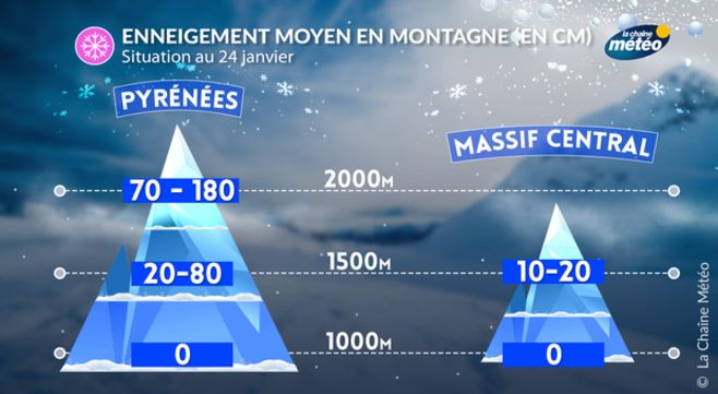 En cette fin de mois de janvier les conditions d'enneigement restent médiocres à basse altitude, à peine correctes à moyenne altitude et satisfaisantes à haute altitude. Le point positif pour les stations a été le retour de l'air froid en altitude en début de semaine qui a permis de faire tourner les canons à neige à plein régime. Mais depuis 2 jours on observe un gros redoux en altitude. A noter des chutes de neige remarquables entre lundi et jeudi sur la partie Est des Pyrénées avec parfois plus d'1,50 m de neige tombée sur le Vallespir et le massif du Canigou à 2000 mètres d'altitude