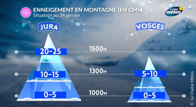 Le manteau neigeux reste très insuffisant dans les Vosges et le Jura mais l'air froid présent en début de semaine en altitude a permis de faire fonctionner les canons à neige et les stations sont souvent partiellement ouvertes. Ce week-end, le temps va rester sec avec des éclaircies en alternance avec des passages nuageux. La neige pourrait faire son retour mardi ou mercredi au dessus de 1200 mètres d'altitude.