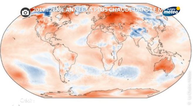 2019 a été une année exceptionnellement chaude à l'échelle du globe avec un excédent de 1,22°C par rapport à la moyenne de la températures de l'ère préindustrielle. Cette année 2019 se situe juste après 2016 qui avait connu un excédent de 1,26°C en grande partie dû au phénomène El Nino qui entraîne un réchauffement important de l'océan Pacifique.