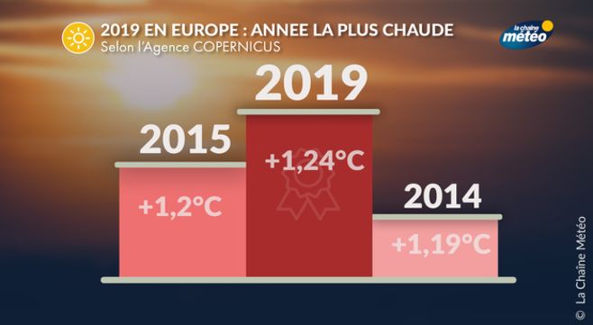 En Europe, 2019 arrive en première position des années les plus chaudes, devant les années 2014 et 2015 avec un excédent de température de 1,24°C par rapport à l'ère préindustrielle. En France, cette année 2019 arrive en 3 ème position des années les plus chaudes avec un excédent de 1,13°C après les années 2018 et 2014.