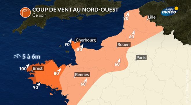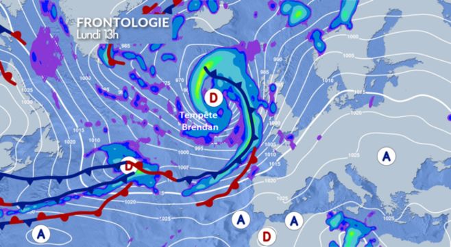 A partir de cet après-midi, le vent se renforce sur les côtes bretonnes. C'est en soirée et dans la nuit prochaine que les vents les plus forts sont attendus sur le nord de la France, situé en marge de cette tempête Brendan. Près du littoral de la Manche, le vent pourra atteindre 100 km/h, voire 110 km/h sur le nord du Finistère, le nord du Cotentin et entre le cap Gris Nez et le Cap Blanc Nez, zones habituellement exposées aux rafales les plus violentes lorsqu'une tempête frappe les îles britanniques.