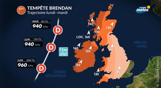 Les îles britanniques s'apprêtent à subir le passage de la tempête Brendan ce lundi suivie d'une possible deuxième tempête mardi. Les vents pourraient atteindre 150 km/h en Irlande qui sera exposée aux rafales les plus violentes.