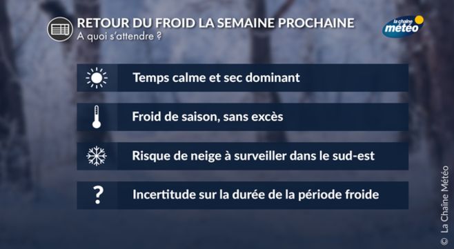 Si la douceur domine encore cette semaine sous l'influence d'un régime de sud-ouest océanique, la situation météo va changer la semaine prochaine avec l'installation d'un anticyclone sur les îles Britanniques véhiculant un flux de nord-est froid et sec sur la France.