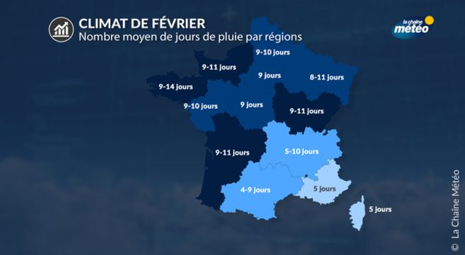 Le mois de février présente le traditionnel dégradé nuageux nord-sud, avec un ensoleillement minimum pour les Hauts de France et maximum pour la région PACA. Entre le nord de la Loire et le pourtour de la Méditerranée, la durée d'ensoleillement varie du simple à plus du double. Les nuages bas et brumeux qui engrisaillent souvent les mois de décembre et de janvier sont moins nombreux, brassés par davantage de vent. L’allongement de la durée du jour favorise un ressenti plus lumineux.