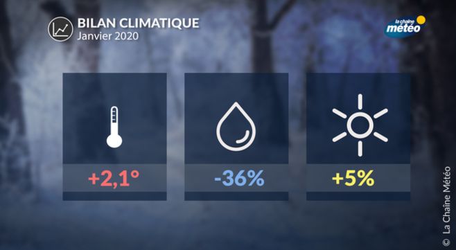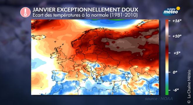Après un mois de décembre déjà très doux (+2,4°C) sur la France, ce mois de janvier est à nouveau particulièrement doux avec un excédent de température de l'ordre de 2,1°C. C'est la majeure partie du continent européen qui a connu un mois de janvier très doux et plus particulièrement l'Europe du Nord avec un excédent qui avoisine 5°C.
