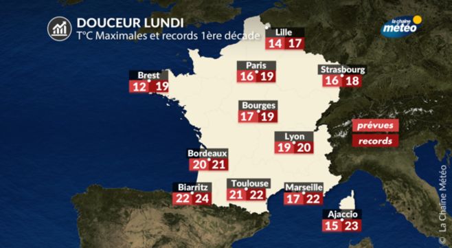 Ce matin, il fait toujours aussi doux, avec des températures du même ordre que dimanche et qui affichent de 10 à 13°C en moyenne avec quelques minimales entre 5 et 7°C dans les vallées d'Auvergne et de Rhône-Alpes. Cet après-midi, le vent de sud accentuera la douceur par rapport à dimanche avec des maximales qui culminent entre 13 et 20°C en moyenne du nord au sud, avec des pointes entre 23 et 25°C sur le pays basque. Excepté de la Bretagne aux Hauts-de-France où les pluies limiteront la hausse des températures, on attend des valeurs supérieures de 10°C aux normales de saison de l'Aquitaine à l'Auvergne et en Occitanie, au niveau des records de douceur pour un début de mois de février. Ces températures seront voisines de celles que l'on observe habituellement mi-avril.