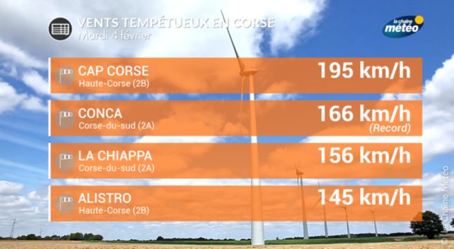 La tempête sévit en Corse avec des vents très violents qui touchent surtout la côte Est. On a observé ainsi 166 km/h à Conca à 11h (record de 2016 battu). Les rafales ont atteint 156 km/h à La Chiappa, 133 km/h à Solenzara, 145 km/h à Alistro, 156 km/h près du cap Sagro et 118 km/h sur Bastia. Sur la côte en Balagne, le vent atteint 161 km/h à l’ïle Rousse. En début de matinée, une rafale maximale à 195 km/h a été enregistrée au Cap Corse.