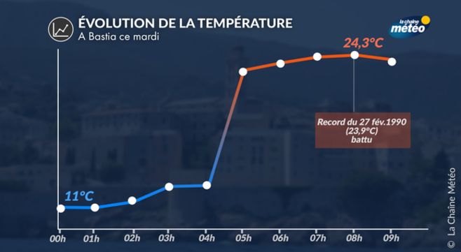 Avec le vent d'ouest (Libeccio) qui s'est brusquement levé dans la nuit sur la région bastiaise, la température a augmenté de 10°C entre 4h et 5h du matin passant de 12°C à 22°C ! Ce réchauffement brutal est du à un effet de foëhn liée à la compression de la masse d'air qui redescend des reliefs. Comme le vent s'est renforcé au fil des heures pour atteindre jusqu'à 115 km/h en rafales, la température a continué de grimper pour atteindre un pic à 24,3°C à 8h28. Le record datant du 27 février 1990 de 23,9°C a donc été battu en ce début de matinée du 3 février.