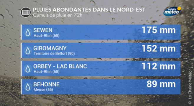 Plusieurs épisodes de pluie actifs ont conerné la partie nord-est de la France au cours des trois derniers jours. C'est entre la Meuse et le relief vosgien que les cumuls de pluie ont été les plus importants. On a relevé en 72 heures 81 mm à Erneville aux Bois (55), 89 mm à Behonne (55), 112 mm à Orbey (68), 152 mm à Giromagny (90), 157 mm au Ballon d'Alsace (68) et 175 mm à Sewen (68). Il est tombé l'équivalent d'un mois de pluie en l'espace de trois jours.