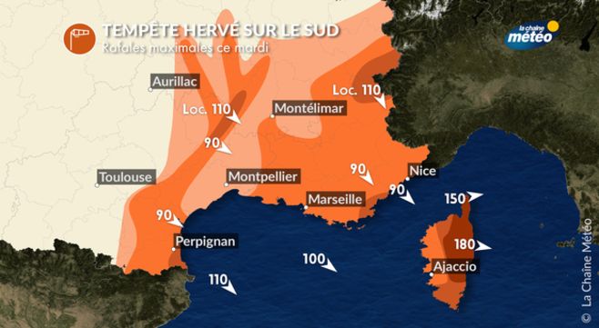 La tempête Hervé, canalisée dans le couloir rhodanien et les reliefs pyrénéens ou languedociens, lève une puissante tramontane ainsi qu'un violent mistral. Les vents pourront souffler jusqu'à 130 km/h dans le Roussillon aujourd'hui.