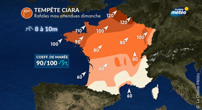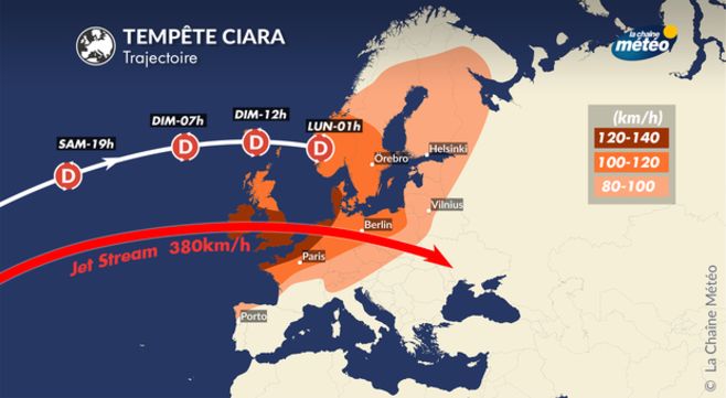 La situation est claire. Les îles Britanniques sont touchées par une violente tempête nommée Ciara. D'autres pays européens, comprenant la France, les Pays-bas, la Belgique, le Danemark, l'Allemagne du nord, la Suède et la Norvège sont aussi touchés par des vents très violents et des pluies importantes dès dimanche.