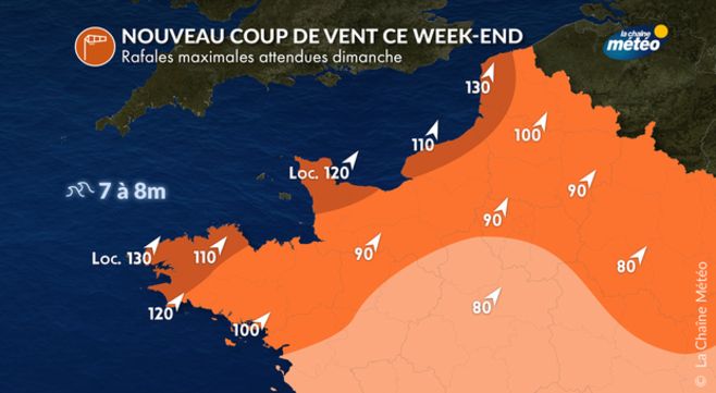 Demain dimanche, les pluies de samedi rentreront un peu plus sur la moitié nord. Jusqu'au Grand Est et l'Île-de-France, les pluies seront présentes. Le coup de vent débuté samedi se poursuivra et pourra même s'intensifier. Les plus fortes rafales pourront dépasser 110 à 120 km/h sur les littoraux du nord-ouest. Sur une petite moitié sud, le soleil se maintiendra et la douceur sera encore plus significative que la veille.