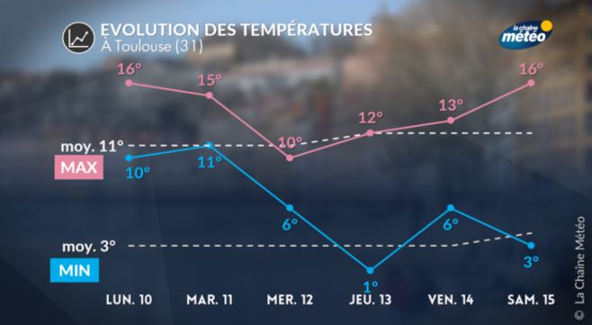 Les températures seront douces lundi, surtout le matin où les nuages, les pluies et le vent empêcheront l'apparition des gelées en plaine. Il fera généralement entre 3 et 10°C au lever du jour. L'après-midi, les maximales afficheront entre 10 et 17°C du nord au sud. De mardi à mardi et jeudi, en raison de l'orientation du vent au nord-ouest, les températures baisseront et rejoindront les normales de saison. Cette baisse des températures s'accompagnera d'abondantes chutes de neige en montagne, à des altitudes de plus en plus basses, comprises entre 600 et 1200 mètres selon les massifs. Les hauteurs de neige pourraient dépasser 1,50 mètre vers 1800 mètres d'altitude sur le nord des Alpes, accroissant le risque d'avalanche qui pourra devenir maximal. Au vent, le ressenti froid et humide sera particulièrement désagréable à supporter.