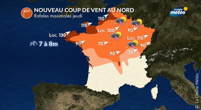 De la Bretagne aux Hauts-de-France, après le passage d’un front froid, une traîne active s’impose avec de fréquentes averses parfois accompagnées de grésil et de coup de tonnerre durant votre après-midi. Le vent qui s’est renforcé durant la nuit souffle fort, à la fois sous le passage du front mais également et surtout sous les grains avec des rafales pouvant dépasser les 120 km/h du littoral du Finistère à la côte d’Opale et 90 à 100 km/h dans l’intérieur des terres.