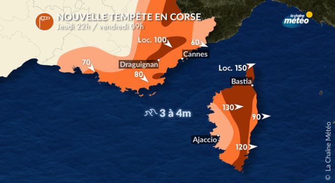 De PACA à la Corse, le temps est plutôt clément et lumineux avec simplement l’installation d’un voile nuageux par l’ouest en journée et l’arrivée de quelques gouttes par la vallée du Rhône et de flocons sur les Alpes du sud dès 1500 mètres. Le vent se renforce très nettement entre la Corse et le continent en soirée et la nuit suivante avec la perspective d'une nouvelle tempête dans la nuit.