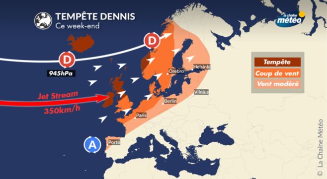 La tempête Dennis balaie actuellement les îles britanniques. Elle provoque des rafales de vents violentes. Les vents forts et puissants touchent encore une fois le Pays de Galles, l'ouest de l'Angleterre et l'Écosse. Elles sont fortes jusque dans la nuit, surtout en Écosse où les rafales les plus puissantes pourraient avoisiner les 160 km/h sur les régions de l'ouest.