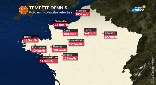 Après la tempête CIARA de dimanche dernier et d’INES jeudi, une troisième tempête, nommée DENNIS a balayé un large tiers nord de la France ce dimanche 16 février. Voici le bilan de cette tempête.