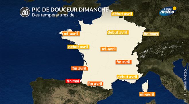 Avec le renforcement des conditions anticycloniques ce week-end, le soleil sera très présent au sud de la Loire et l'ambiance deviendra printanière l'après-midi après la fraîcheur matinale. Les températures seront généralement comprises entre 16 et 20°C sur une large moitié sud dimanche après-midi avec des pointes à 22-23°C au pied des Pyrénées. Au nord, sous un ciel plus nuageux, le flux de sud-ouest ramènera aussi beaucoup de douceur avec des températures généralement comprises entre 13 et 15°C l'après-midi. Ces températures correspondent à un niveau de mois d'avril et même d'un mois de mai pour les régions situées au sud de la Garonne.