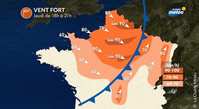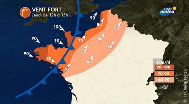De la Bretagne à l’Île-de-France, en passant par les Hauts-De-France et la région Centre-Val de Loire, le ciel est nuageux avant le passage du front froid actif de la perturbation. Celui-ci apporte des pluies et du vent fort sur la Bretagne dès midi avant de se déplacer à l’intérieur des terres en direction de la Normandie, puis vers les Hauts-De-France et l'Ile-de-France. Son arrivée est attendue entre 15h-17h sur les Hauts-De-France et entre 18h-19h dans la capitale. Le passage du front actif de cette perturbation engendre un bref coup de vent avec des pluies fortes et des rafales pouvant atteindre entre 80 et 95 km/h sur les Hauts-De-France(Lille) et entre 70 et 90 km/h sur les autres départements du nord de la Seine notamment Paris. Prudence au volant lors du passage de ce front car ce brusque et violent changement de temps peut rendre les conditions de circulations difficiles.