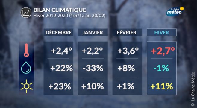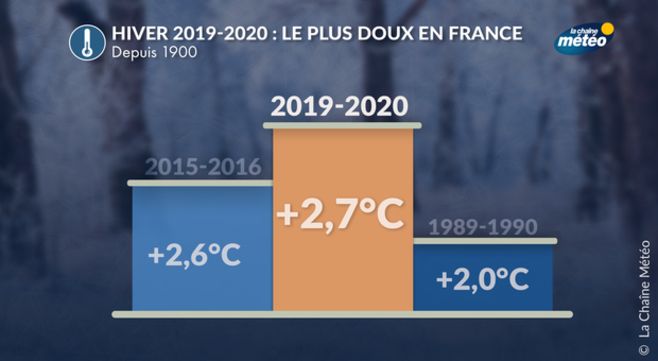 A la date du 28 février, l'hiver 2019-2020 présente un excédent de température de +2,7°C par rapport à la normale calculée sur la période 1981-2010. Il s'agirait donc de l'hiver le plus doux depuis plus d'un siècle, juste après l'hiver 2015-2016 (+2,6°C) et l'hiver 1989-1990 (+2,0°C).