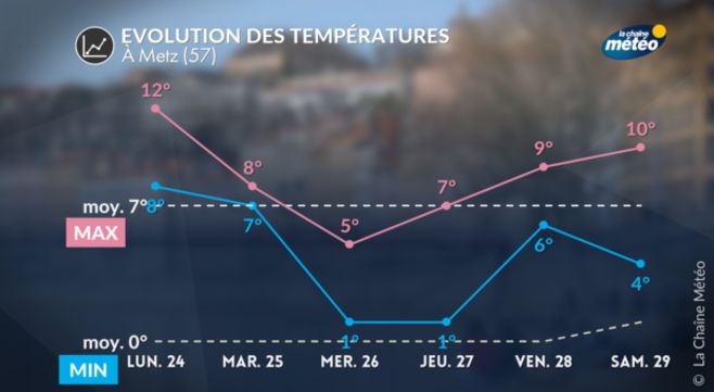 Après un lundi doux, les températures baisseront à partir de mardi pour revenir dans les moyennes de saison. Mais le vent pourra par momenst accentuer la sensation de fraîcheur, et même de froid (un froid qui restera de saison). Les gelées en plaine seront de faible intensité et peu généralisées. Les maximales s’échelonneront entre 10°C au nord et 13°C au sud. Elles seront temporairement plus basses mardi et mercredi en raison de l'orientation du vent au Nord-ouest après le passage de la perturbation de mardi.