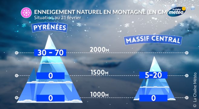 L'enneigement reste très insuffisant dans le Massif-Central en raison des températures trop élevées pour permettre le maintien du manteau neigeux. Seules quelques pistes de ski sont praticables dans certaines stations comme La Bresse ou Le Lioran. Il s'agit d'une neige très humide étant donné le niveau des températures.