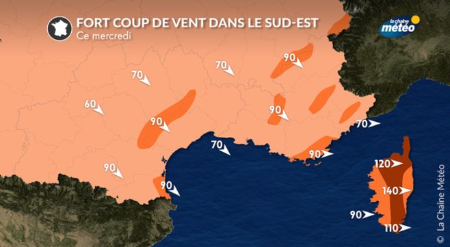 En PACA et en Corse, le soleil revient mais le vent souffle très fort sur l’extrême sud-est et même en tempête sur la Haute-Corse avec des rafales sur le Cap Corse et la Montagne Corse entre 120 et 140 km/h.