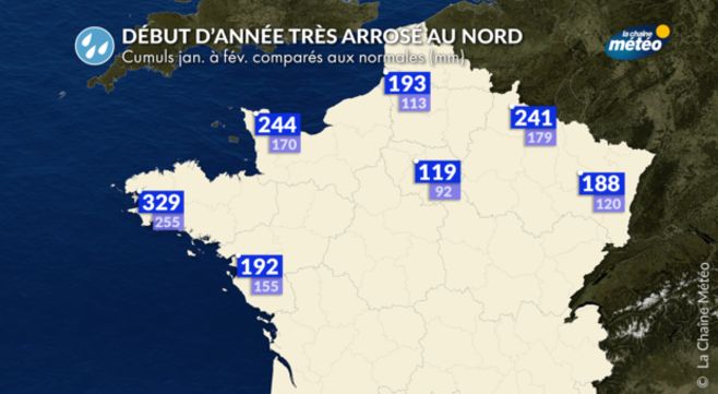 Après un mois de janvier un peu déficitaire en précipitations, le mois de février a été très arrosé dans l'ouest et le nord du pays. A Abbeville dans la Somme, il n'avait jamais autant plu en février avec 139 mm (ancien record : 136 mm en février 2002). A Paris, avec 91 mm, il a plus deux fois plus que la moyenne avec 21 jours de pluie sur 29. Même constat dans le nord-est avec 161 millimètres de pluie recueillis à Charleville-Mézières pour une normale de 77 mm. A Nancy avec 154 mm on a failli battre le record de pluviométrie mensuelle de mars 1970 avec 159 mm.