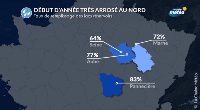En terme de pluviométrie, on est passé d'un déficit pluviométrique important l'été dernier avec jusqu'à 85 départements en restrictions d'eau à un excès pluviométrique important à l'automne. Cet hiver, les précipitations sont restées abondantes dans l'ouest et le nord tandis que le centre-est et la partie sud du pays ont été beaucoup moins arrosées.