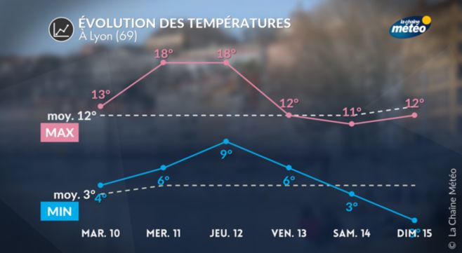 Après un lundi assez frais, nous passerons sous l'influence d'un vent océanique jusqu'à jeudi. Le matin, les gelées seront quasi inexistantes à cause des nuages et de la pluie mais aussi du vent avec 3 à 10°C en général du nord au sud. L'après-midi, les maximales afficheront de 11 à 16°C du nord au sud, avec des pointes entre 18 et 20°C du bassin aquitain au sud de Rhône-Alpes aux rivages de la Méditerranée de mardi à jeudi. On se situera 2 à 5°C au-dessus des moyennes. A partir de vendredi, une baisse des températures est envisagée avec la bascule du vent au nord-ouest.