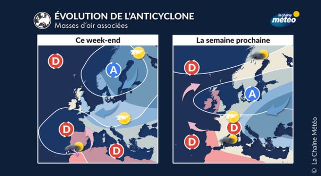 L'anticyclone centré ce week-end en mer du Nord gagnera les ¾ du pays la semaine prochaine assurant un temps calme et sec. Mais les régions du sud-est resteront sous la menace d'averses en raison d'un système dépressionnaire étendu de l'Europe centrale à l'Espagne. Cette situation canalisera un flux de nord-est continental très frais, et même froid.