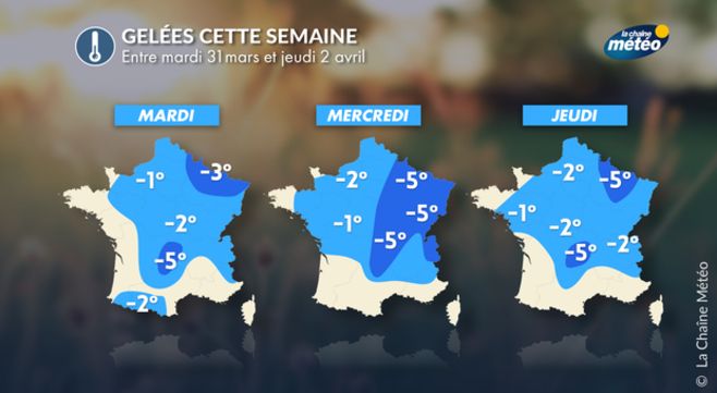 Dès ce lundi matin, il gèle sur les régions du nord et du nord-est avec des températures de 0 à -3°C. Le ressenti avec la bise de nord-est modéré est glacial. Mardi et mercredi, les gelées s'étendront à la plus grande partie du pays en épargnant certains littoraux et l'extrême sud. Les températures seront souvent comprises entre -1 et -3°C, mais pourront descendre à -5 à -6°C entre l'Auvergne et le nord-est et dans les vallées alpines. En altitude, on attend jusqu'à -10°C vers 1200 mètres ce qui est remarquable pour la saison. Etant donné l'avance de la végétation, le risque de dégâts sera important sur les fruitiers et plantes sensibles au froid.