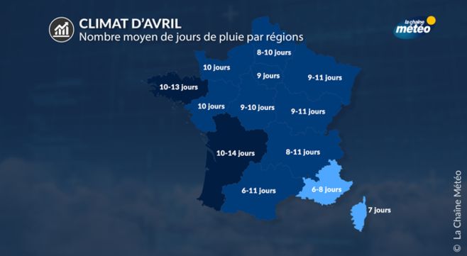 Les fortes perturbations hivernales se raréfient en avril. Parfois présentes en début du mois, elles peuvent provoquer des chutes de neige en plaine statistiquement jusqu’au 10 avril pour les plus tardives (Hauts de France, Ile de France, Normandie). Ensuite, les précipitations prennent davantage un caractère d’averses, tombant de façon hétérogène sur le territoire. On peut encore parler de giboulées dans la mesure où elles tombent parfois sous forme solide (grésil, neige fondante) sous des ciels très changeant où bourgeonnent les « nuages choux fleurs », les gros cumulus et les cumulonimbus(nuages d'orages). Ces derniers provoquent souvent les premiers orages mais généralement peu violents. Tout comme pour l’ensoleillement, les moyennes des précipitations deviennent assez homogènes sur l’hexagone. La plaine d’Alsace reste néanmoins la région la plus sèche de France. Il pleut également autant autour de la Méditerranée qu’à Lille.