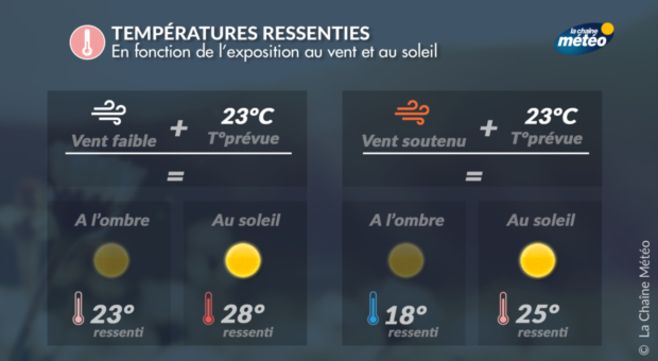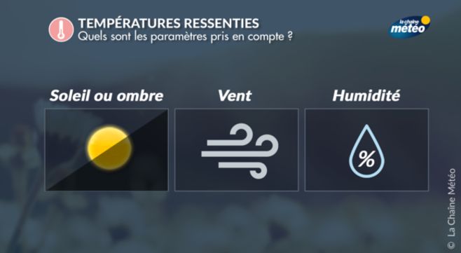 En météorologie plusieurs paramètres sont utilisés pour calculer une température ressentie. Il existe différentes formules qui visent à obtenir une valeur "au plus près" de la température que vous ressentez réellement. La température annoncée tous les jours dans nos bulletins est la température prévue sous abri. Cependant, votre ressenti peut-être bien différent en raison du fait que vous pouvez soit être à l’ombre, soit être au soleil, être exposé au vent ou non et être dans un environnement humide ou sec. L’exposition, le vent et l’humidité de l’air sont donc les trois paramètres que nous prenons en compte à la Chaine Météo dans le calcul de la température ressentie.