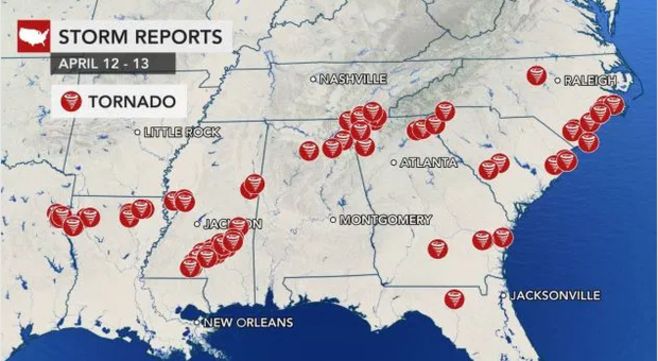 De dimanche à lundi, une cinquantaine de signalisations de tornades ont été faites du Texas aux Carolines. Les enquêtes sont encore en cours sur le terrain pour déterminer le nombre exact de tornades ainsi que leur intensité. Le dernier bilan humain fait état de 32 victimes dans six états distincts. Ce bilan humain pourrait être plus lourd encore dans les heures à venir.