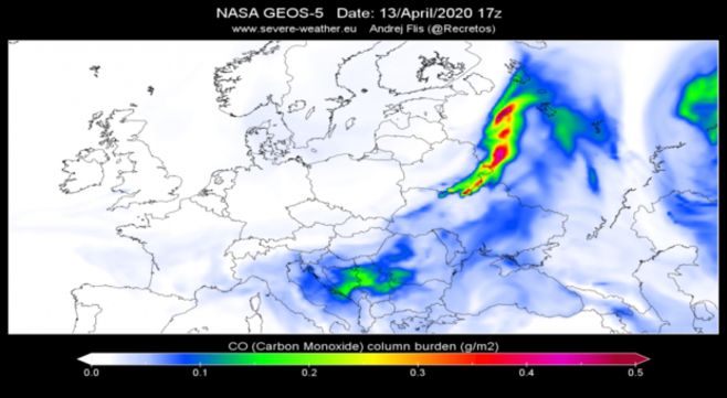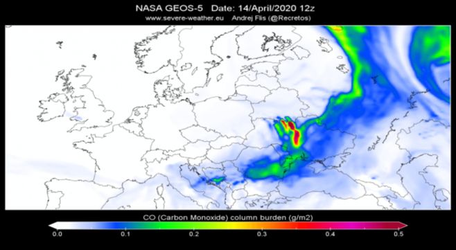 Selon les images, les fumées traçables par monoxyde de carbone se sont dirigées au nord et nord-est de la zone contaminée et incendiée. Avec l’arrivée d’un front froid entre lundi et mardi, celui qui a apporté les pluies salvatrices, le vent a changé de direction et ces fumées se sont dirigées dans le sens opposé : à savoir vers le sud, en direction de la capitale du pays, Kiev.