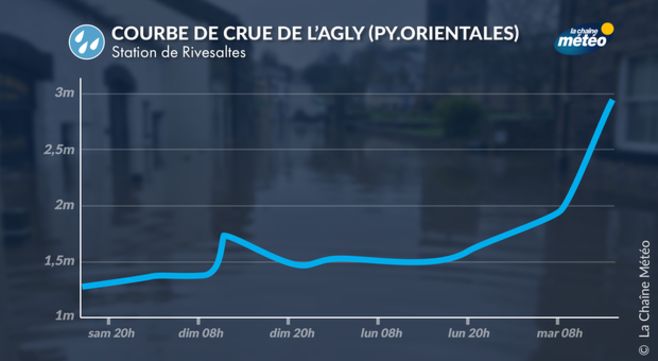 C'est d'ailleurs l'ensemble de ce département qui est touché par plus d'1 à 3 mois de pluies depuis 3 jours. Des cours d'eau ont réagi, avec des débordements signalés, comme la Têt à Perpignan qui a dépassé son niveau de la crue du 16 décembre 1995.