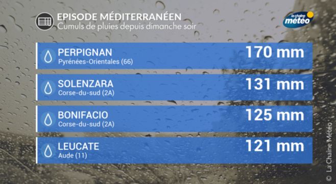 Le sud de la France subit un épisode d'intempéries jusqu'à mercredi. A Solenzara en #Corse et à #Perpignan en Roussillon, il est déjà tombé l'équivalent d'1 mois et demi de pluies depuis dimanche après-midi. pic.twitter.com/qjwpULSJ2N