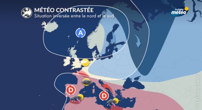 Animation satellite saisissante ! Gigantesque #anticyclone, ciel tout bleu et #sécheresse persistante sur le nord de l'Europe... Alors que les pays méditerranéens sont touchés par un puissant système dépressionnaire et de fortes pluies qui provoquent des #inondations. pic.twitter.com/wAd8CgnM65