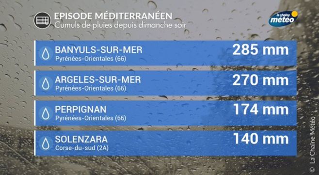 A Banyuls-sur-mer (66), il est tombé 285mm de pluies au cours de ces 3 derniers jours. A Perpignan il a plu sans discontinuer pendant 75 heures avec un cumul de 174 mm, équivalent à 3 mois de pluies. En Corse, les cumuls de pluie les plus importants ont été mesurés sur la côte est et le sud de l'île, à Solenzara (140 mm), à Bonifacio (134 mm) et à Porto-Vecchio (100 mm).
