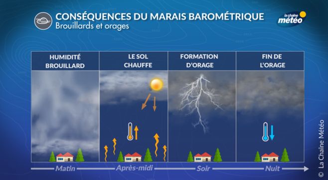 Les situations de marais barométrique favorisent la formation d’orages et d’averses orageuses quand l’atmosphère est humide et que l’ensoleillement est important, on parle alors d’averses d’évolution diurne. Cette tendance orageuse peut être accentuée par la présence de reliefs, qui favorisent les courants ascendants, mouvement accentuant la formation des nuages d’orages tels que les cumulus congestus et cumulonimbus.
