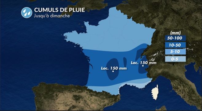 - des pluies continues pendant 48 heures, avec des cumuls entre 50 et 100 mm, et localement 150 mm sur les versants ouest du Massif central, ainsi que sur le nord des Alpes et le Jura, équivalent à 1 mois et demi de précipitations.