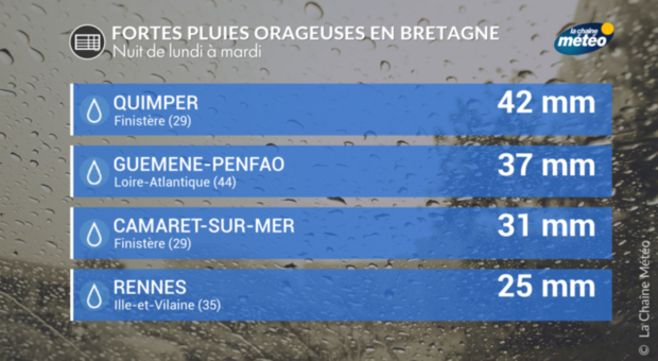 Entre la Bretagne et la Loire-Atlantique, la perturbation a avancé beaucoup moins vite, bloquée par une cellule anticyclonique présente sur le sud de l'Angleterre. Cette perturbation a stagné toute la nuit dans le nord-ouest du pays avec des cumuls de pluies qui ont atteint 42 mm à Quimper, 37 mm à Gemene et 25 mm à Rennes, équivalent à 2 semaines de précipitations sur le sud du Finistère.