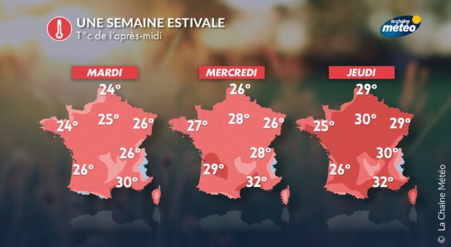 La hausse des températures qui a débuté ce week-end se poursuivra jusqu'à jeudi. Les températures repasseront largement au-dessus des normales de saison mercredi et jeudi après-midi partout. Il fera chaud avec 25 à 30°C du nord au sud, un niveau de plein été. Vendredi, après le passage d'une perturbation assez atténuée avec quelques orages, les températures baisseront un peu sur l'ouest.