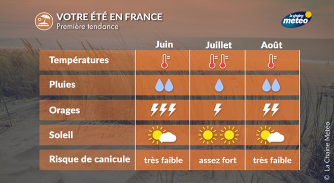 En conclusion, on retiendra pour ces vacances d’été une météo favorable pour les amateurs de beau temps. Le tourisme devrait apprécier ces belles conditions, qui serviront surtout la moitié nord de la France. Les bords de mer seront favorisés par un bel ensoleillement tandis que les montagnes seraient plus orageuses. Cependant, la sécheresse risque de s’accentuer sur des zones déjà sèches notamment au nord, et le risque de fortes chaleurs semble inévitable, même si les épisodes caniculaires semblent devoir être moins marqués que l’année dernière.