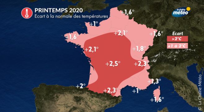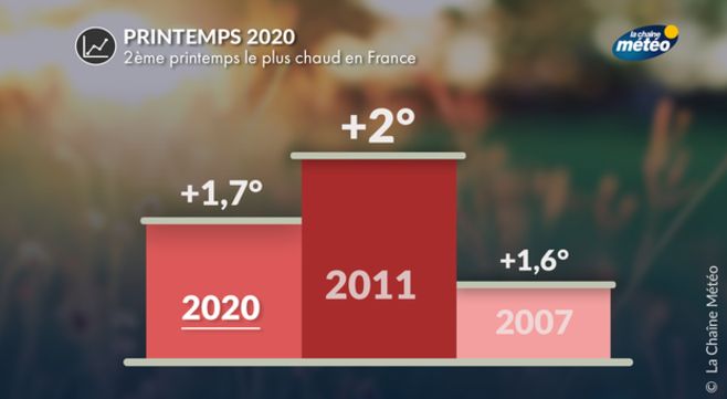 Avec un excédent de température de l'ordre de 1,7°C en moyenne sur la France sur les 3 mois de mars, avril et mai, ce printemps 2020 est donc exceptionnellement doux puisqu'il arrive en deuxième position des printemps les plus chauds après 2011 (+2,0°C) et juste avant 2007 (+1,6°C). Le mois d'avril aura été particulièrement chaud avec un excédent de l'ordre de 3°C sur la France ; il arrive en 3ème position des mois d'avril les plus chauds après avril 2007 et avril 2011.