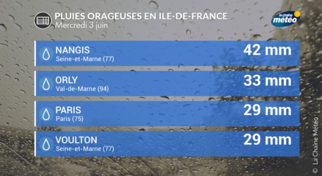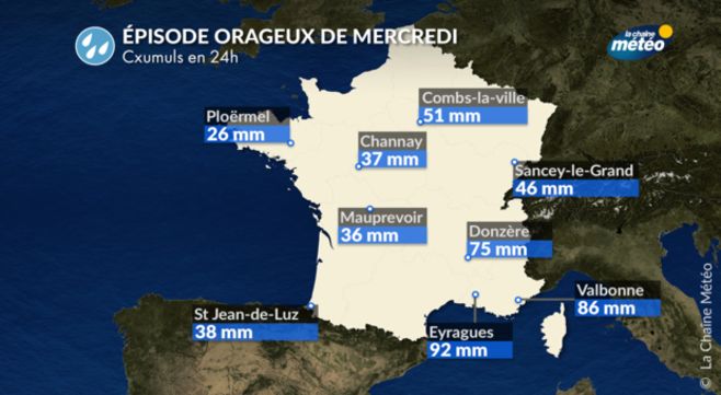 Les orages de mercredi soir et de la nuit dernière ont été localement violents mais assez isolés. Cependant, la région parisienne a subi le passage de forts orages occasionnant une nouvelle fois des inondations et des chutes de grêle. Ces orages ont cessé dans la soirée. Par ailleurs, et comme prévu, le front orageux est arrivé dans la nuit au sud-est, avec de très forts orages vers 01h du matin, ayant occasionné des cumuls de pluie compris localement de 60 à 90 mm, l'équivalent d'un mois de pluie.